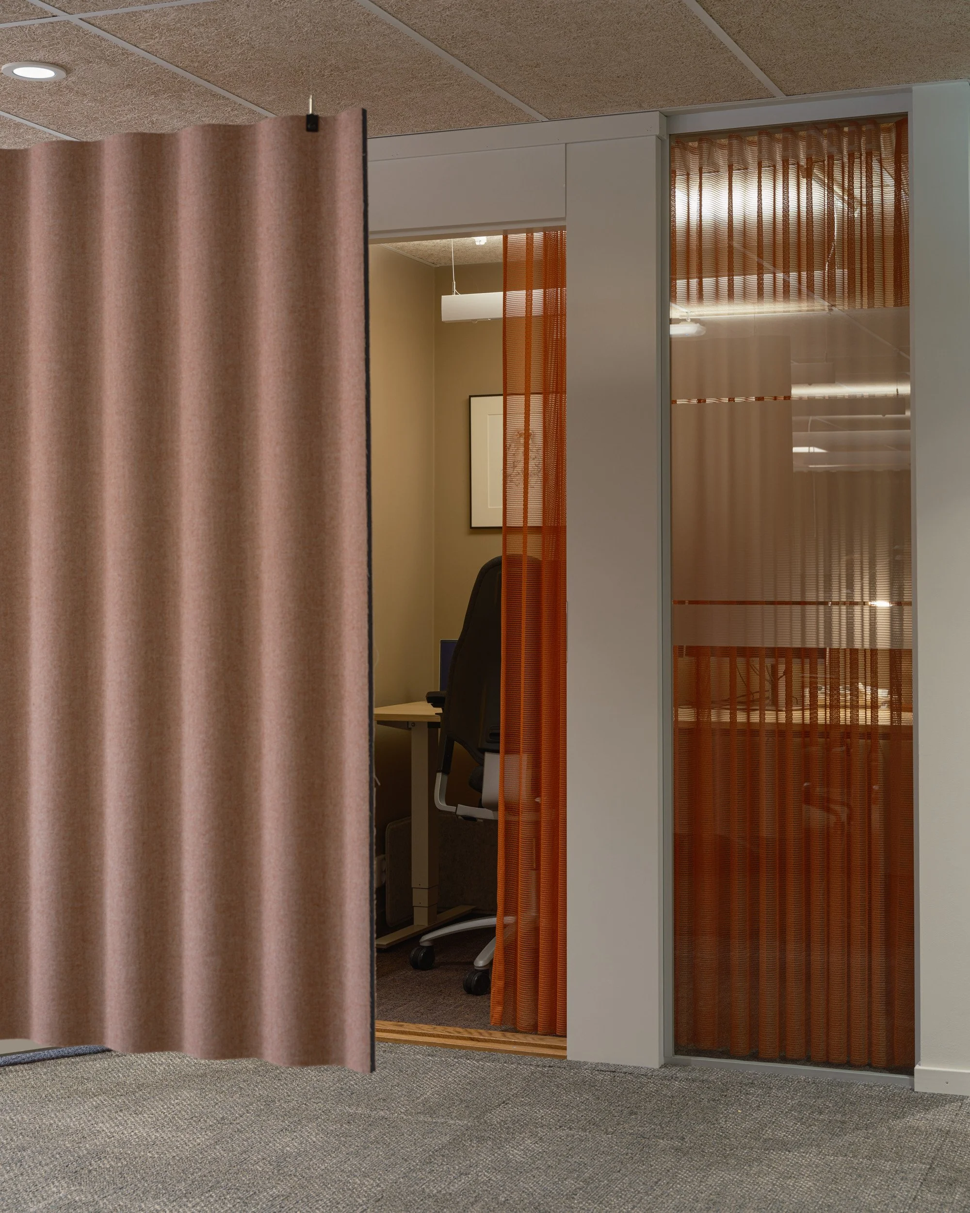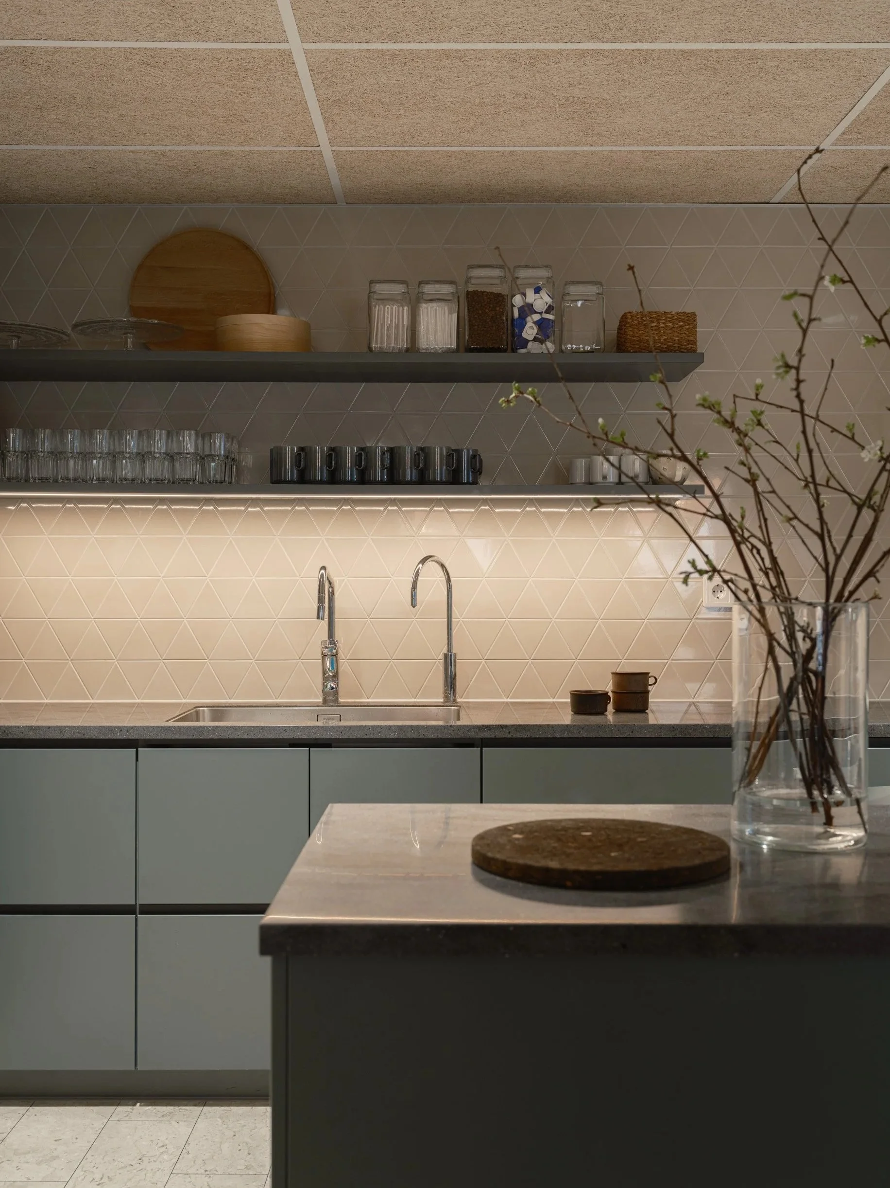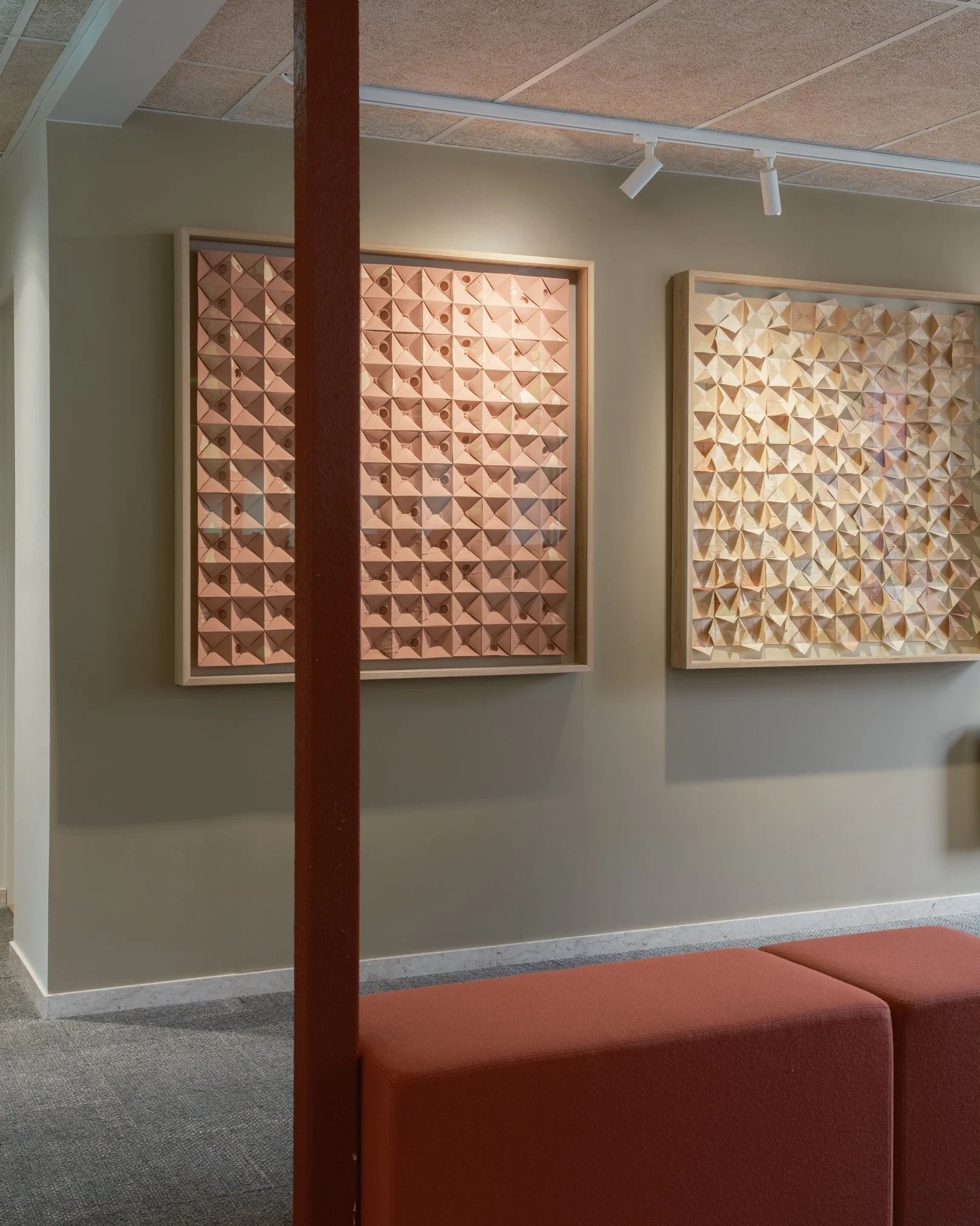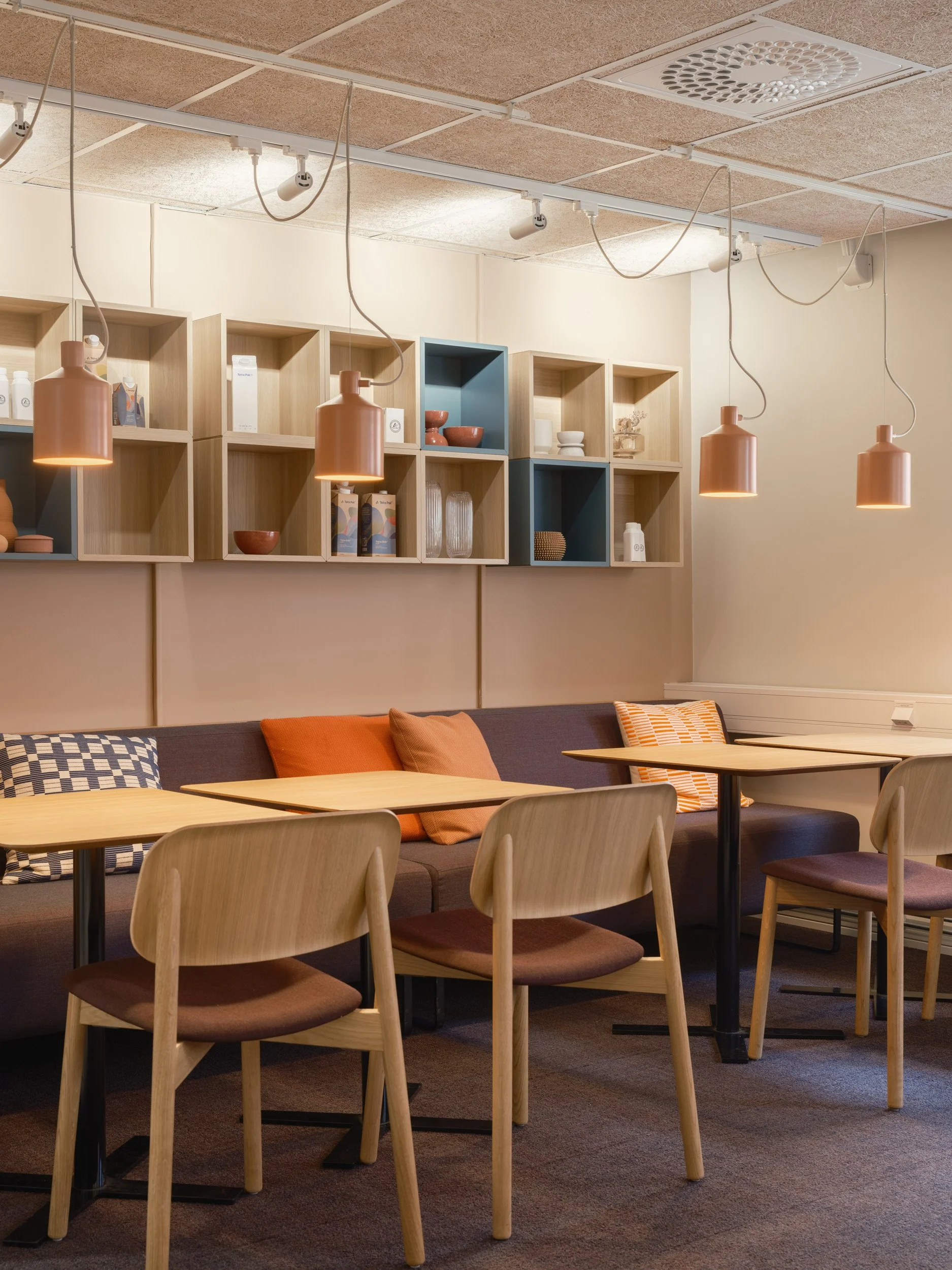 Med en varm och naturlig färgskala ville vi välkomna och omfamna, men också skapa lugn och intimitet i arbetsmiljön.